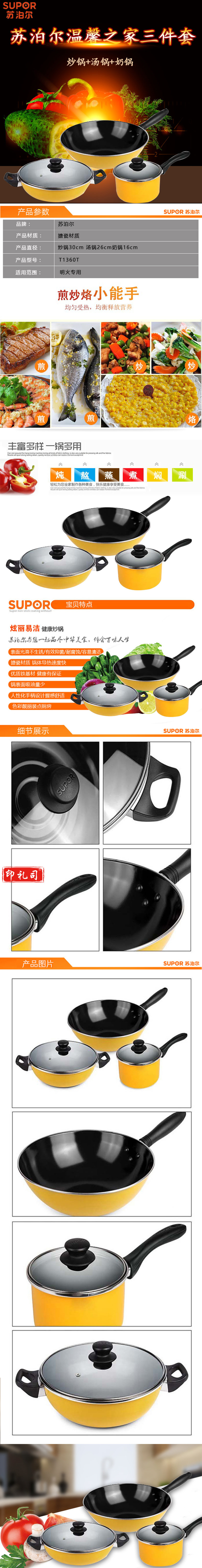苏泊尔T1360T温馨之家三件套 30cm炒锅+26cm汤锅+16cm奶锅 柠檬黄色
