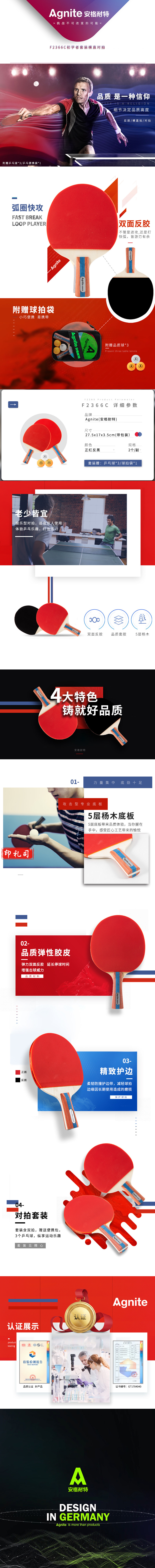 安格耐特F2366C乒乓球拍横直对拍(正红反黑)(2支/副)(带三球)