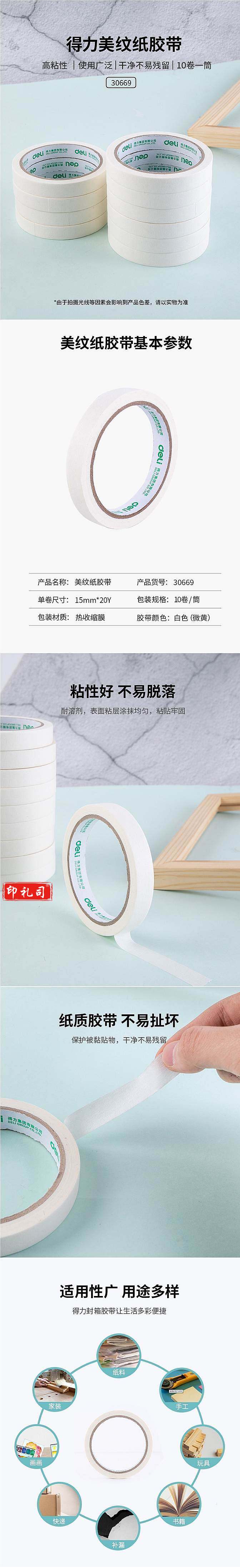 得力30669美纹纸胶带15mm*20Y*145um(白色)(10卷/筒)(单位:筒)