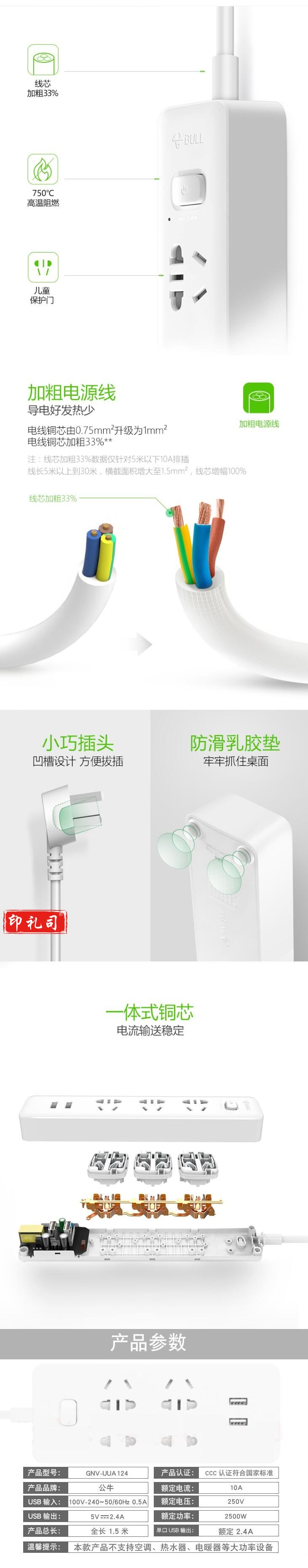 公牛(BULL) GNV-UUA124 USB插座智能插座充电插排拖接线板 GN-B422U升级版 1.5米 10A
