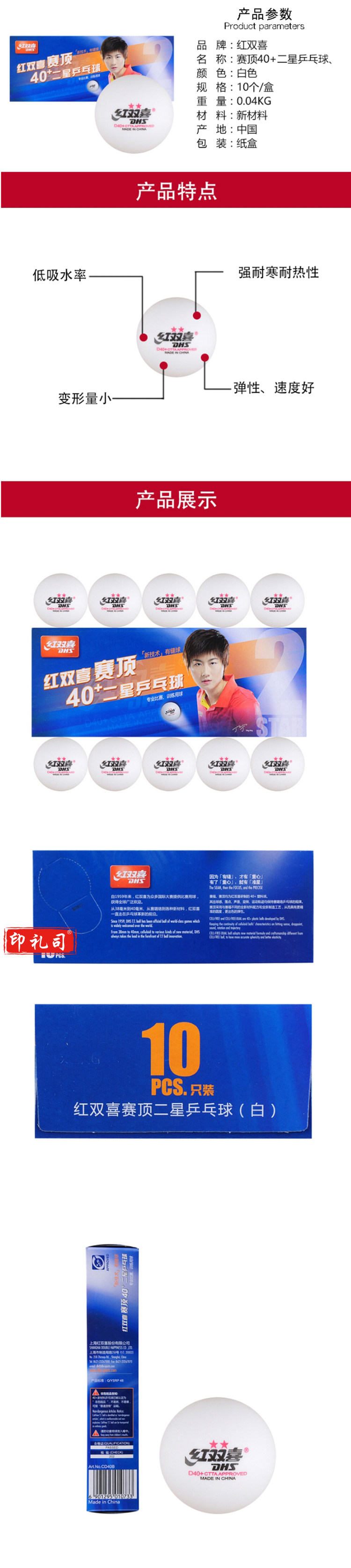 红双喜 赛顶2星乒乓球 CD40B ABS新材料40mm+(10只装) 白色