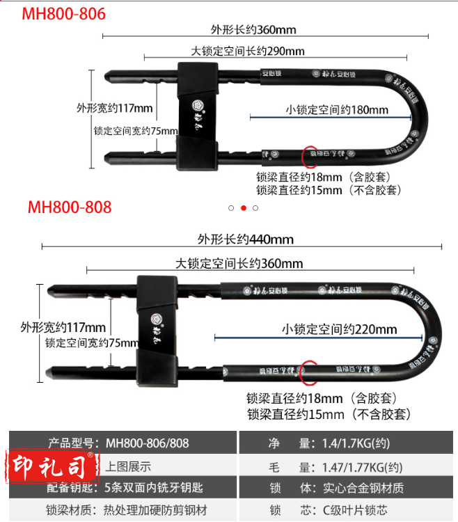 梅花(BLOSSOM)800-806 玻璃门锁 防盗C级锁芯 防水防撬挂锁U型锁 电动摩托车锁