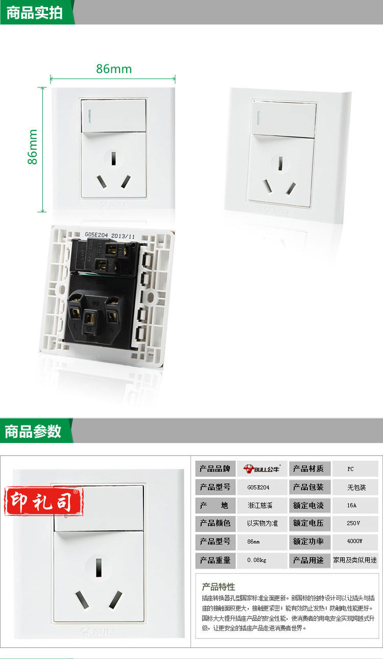 公牛 G05E204 墙面开关(插座) 白色 墙面开关带插孔