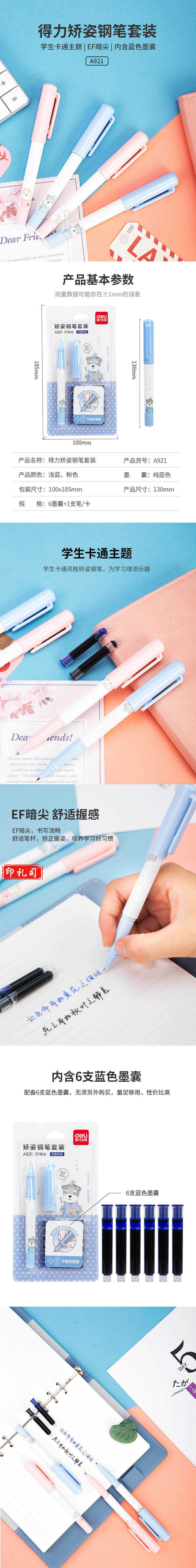 得力A921矫姿钢笔套装(可擦纯蓝)(6墨囊+1支笔/卡)-