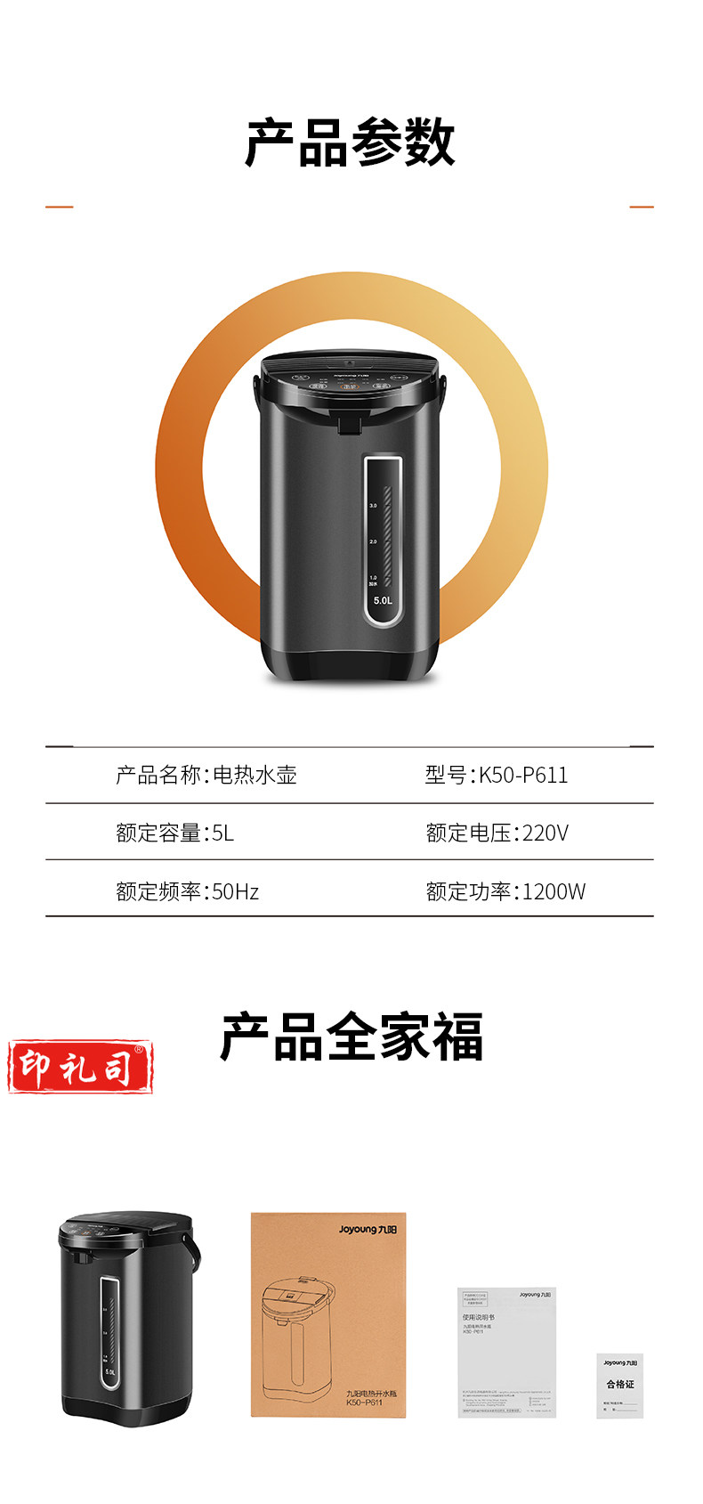 九阳(Joyoung)电热水瓶K50-P611 6段温控 沸腾除氯 支持童锁 304不锈钢 5L 保温恒温电水壶开水瓶