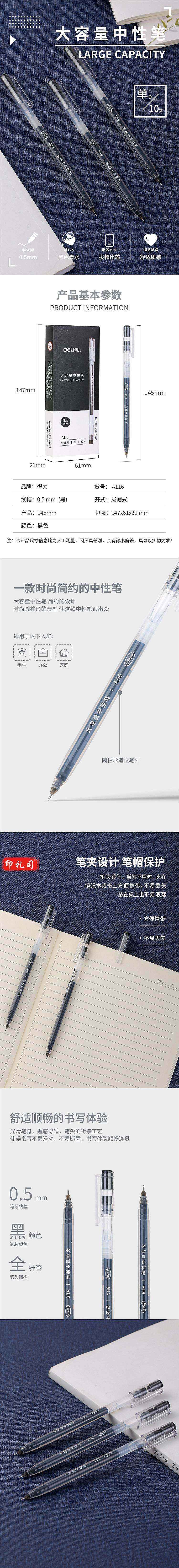 得力A116大容量中性笔0.5mm全针管(单位:支)黑