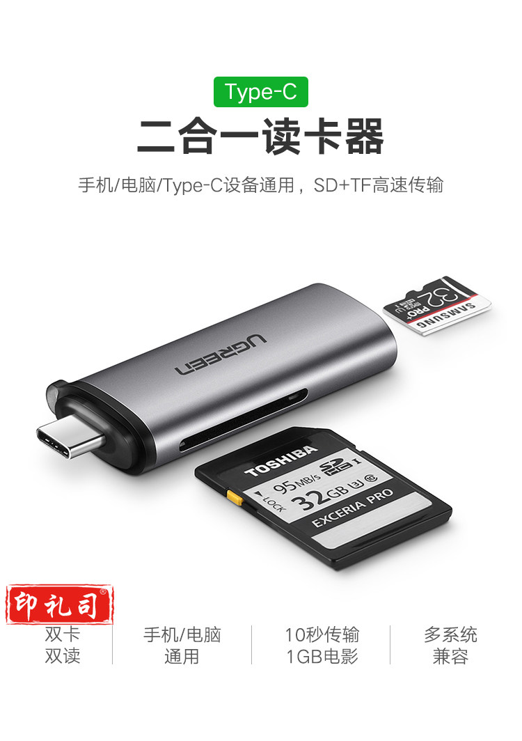 绿联 UGREEN 多功能二合一读卡器 50704 OTG 支持SD/TF内存卡