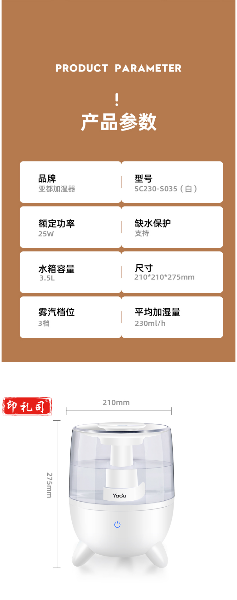 亚都(YADU)SC230-S035 加湿器 卧室静音大雾量过滤加湿 上加水 3.5升 卧室孕妇婴儿家用触控加湿器 白色