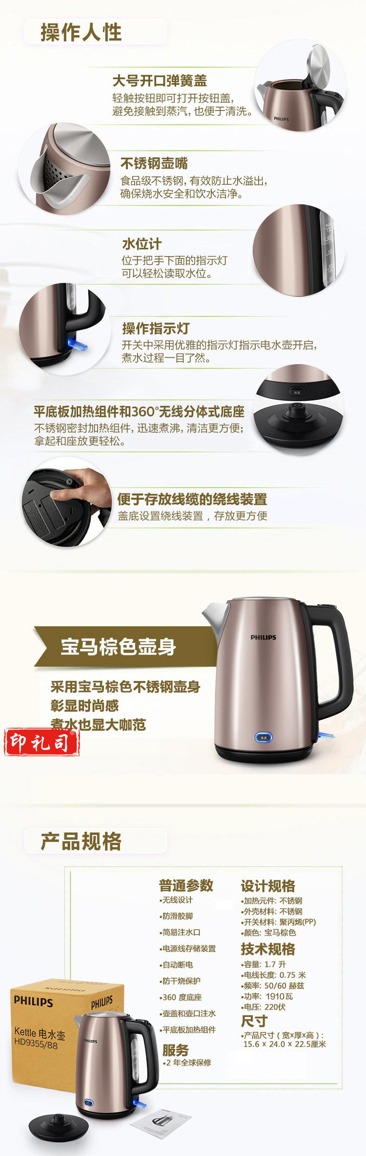 飞利浦(PHILIPS)HD9355/88 电水壶热水壶电热水壶不锈钢1.7L防干烧带保温功能