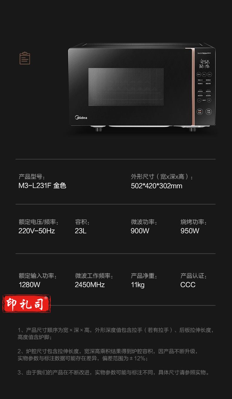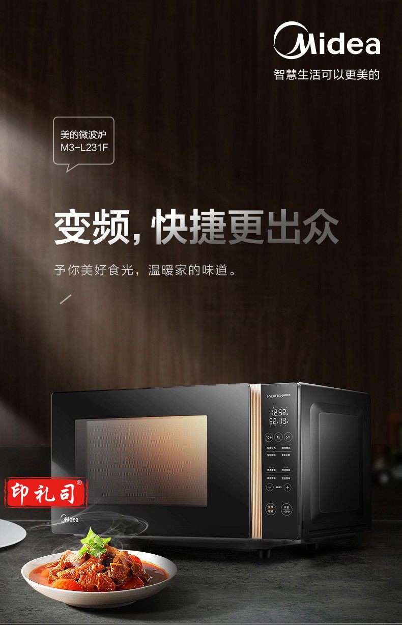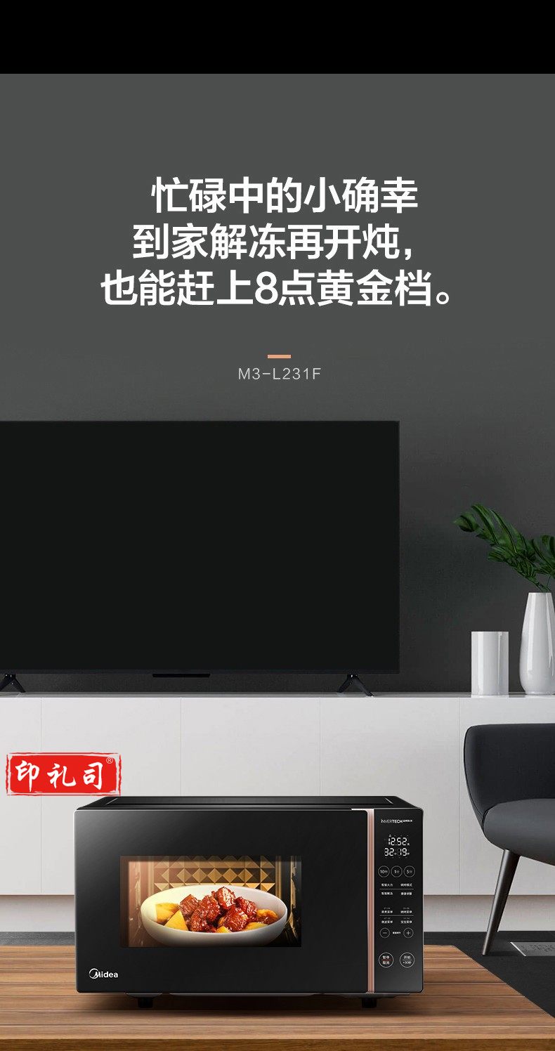 美的M3-L231F 平板加热微波炉 23L大容量 黑色