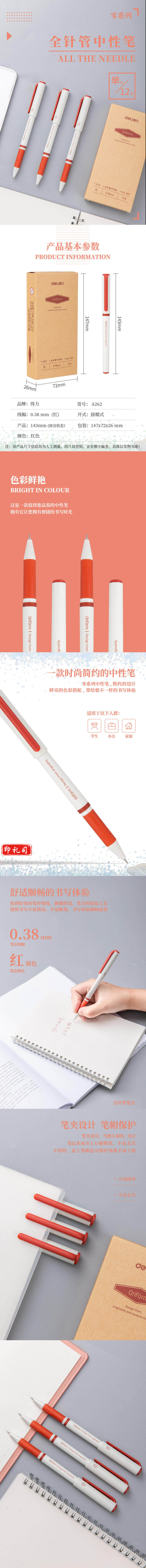 得力 A262 学生中性笔 0.38mm全针管(红)