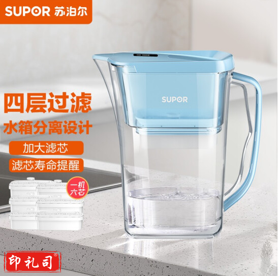 苏泊尔(SUPOR)J-UF01 过滤净水器 家用滤水壶 自来水过滤器净水壶 (蓝色)一壶六芯