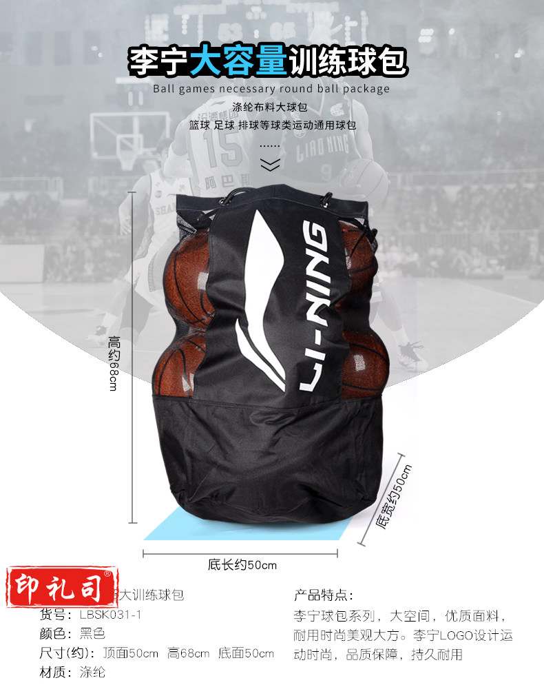 李宁LI-NING篮球包LBSK031-1 大号球袋足球排球训练专用收纳大网袋球包