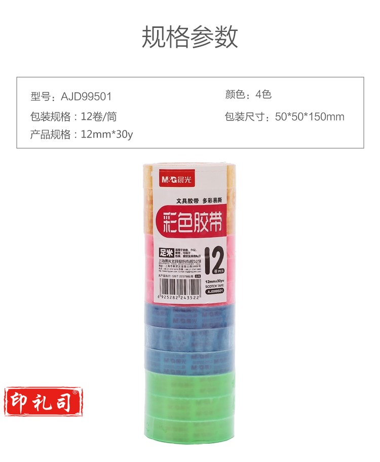晨光 AJD99501 彩色文具胶带 12mm*30y/4色 12卷/筒