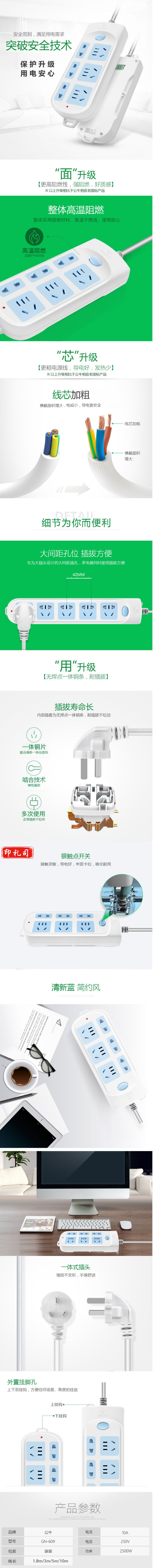 公牛插排插板电源接线板拖线板插排 6孔3米