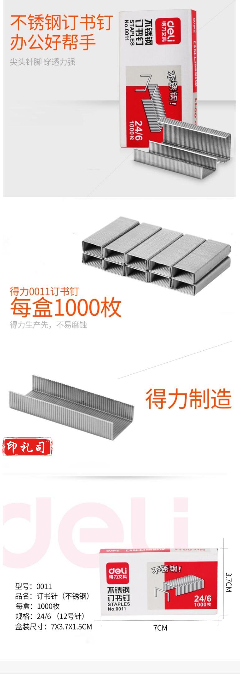 得力0011订书钉不锈钢订书针12# 24/6 可订25张 1000枚/盒