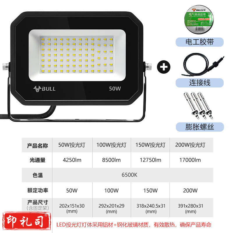 公牛(BULL)LED投光灯庭院灯工地灯园林照明露营灯 IP65防水100W-6500K白光