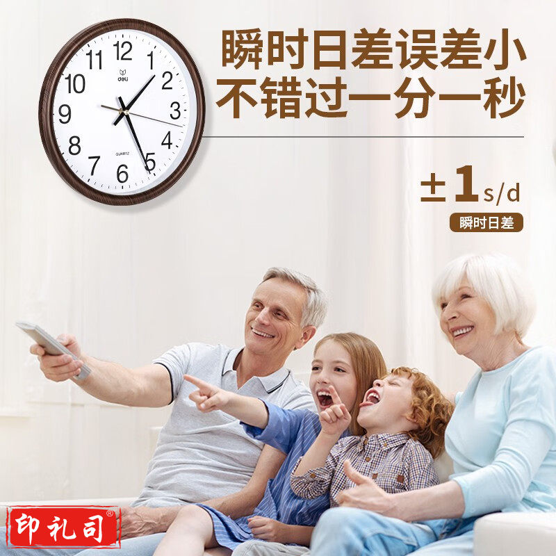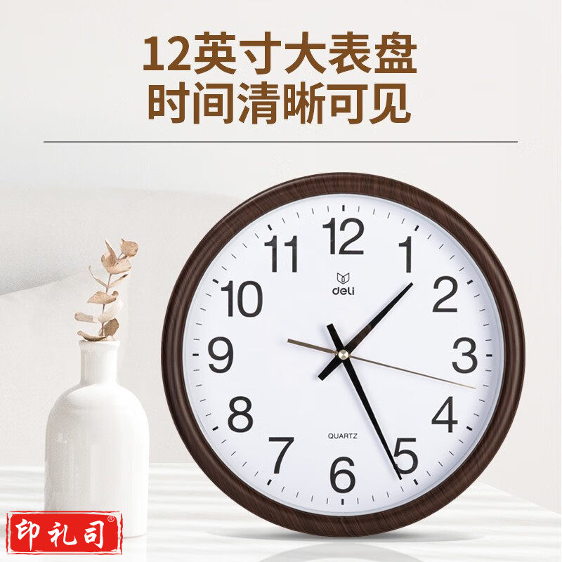 木纹挂钟客厅简约时尚圆形时钟低噪扫秒客厅家用卧室现代风钟表 12英寸
