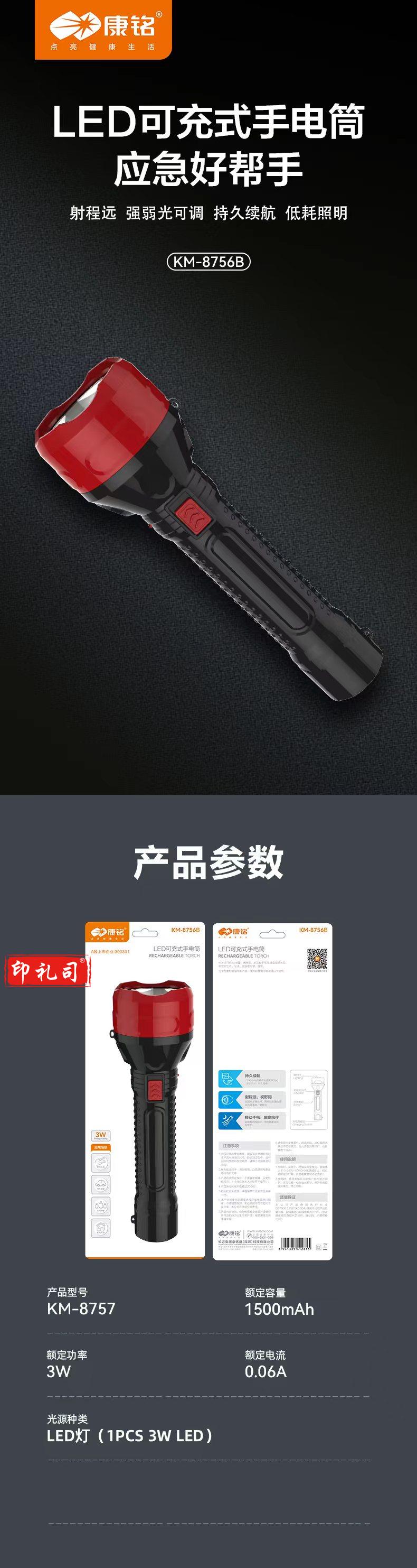 康铭大功率LED手电筒手提应急探照灯强光远射家用充电户外巡逻灯 KM-8756B