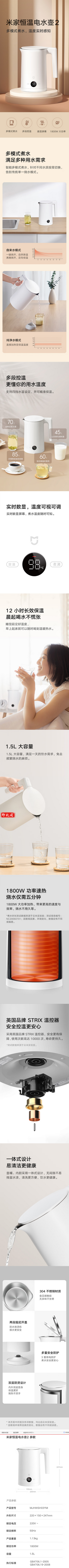 米家 恒温电水壶2 多段控温 高清实时数显 双模式煮水 1800W速热烧水