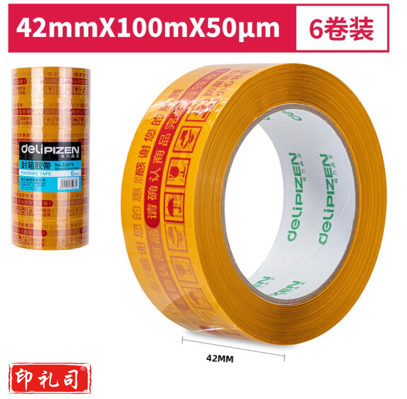 得力品正33974快递封箱胶带42mm*100m*50μm(黄底红字)(6卷/筒