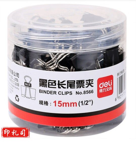 得力(deli)8566-6#黑色长尾票夹15mm筒装(黑)(60只/筒)
