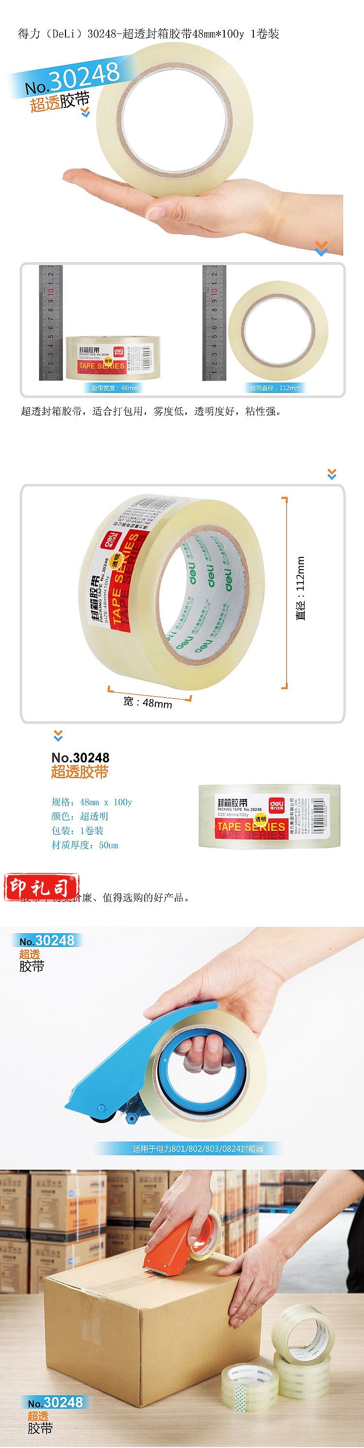得力 30248 胶带超透明封箱胶带 48MM*100Y(单位 卷)