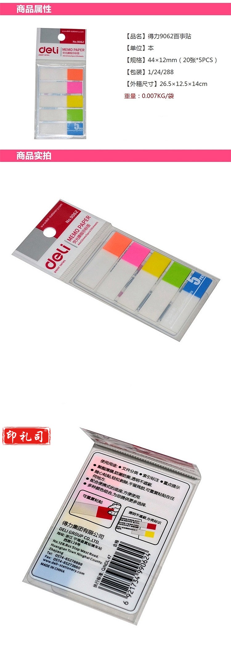 得力 9062 5色荧光膜指示贴 44x12mm(单位 包)