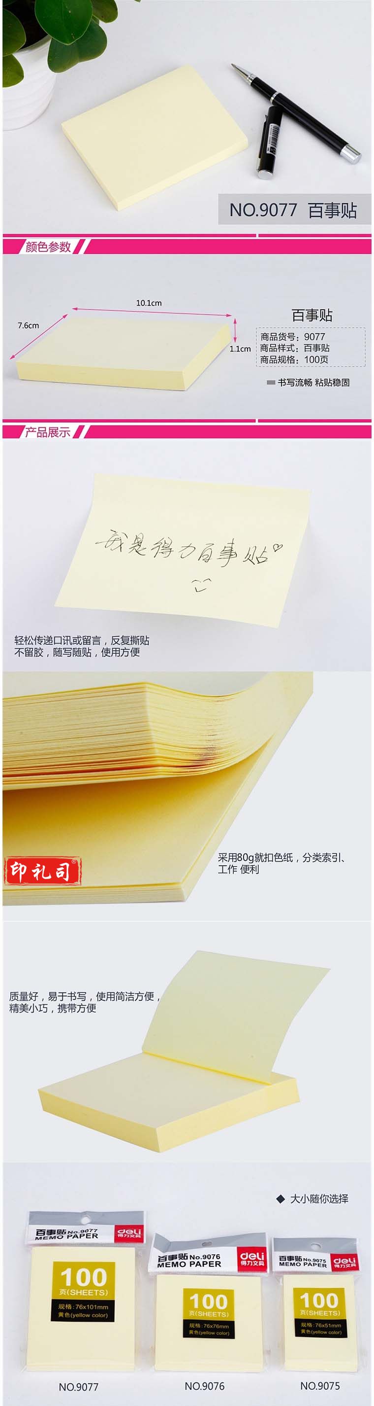 得力 9077 便利贴 76x101mm 黄(单位 包)