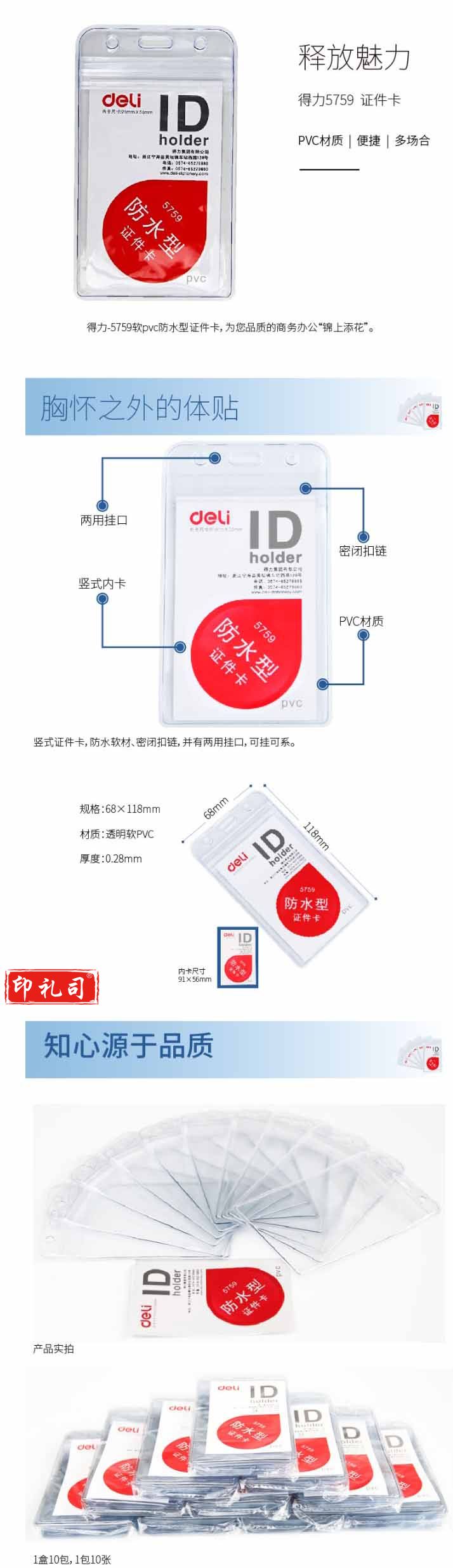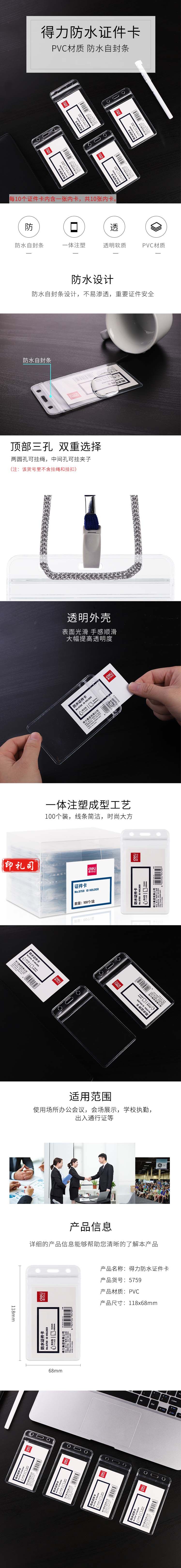 得力 5759 PVC竖式透明防水证件卡套 10个/包(单位 个)