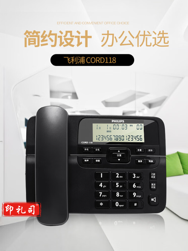 飞利浦(PHILIPS)电话机座机 固定电话 办公家用 来电显示 双接口 免电池 CORD118黑色 办公伴侣