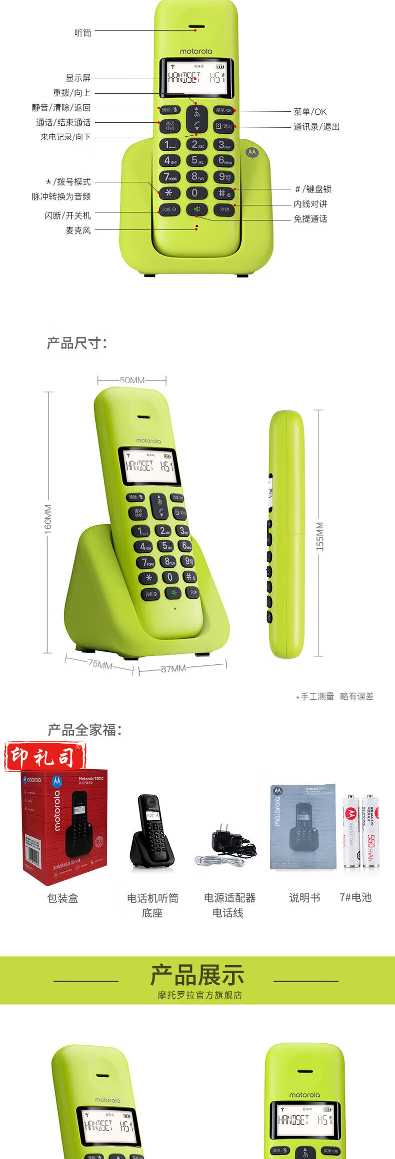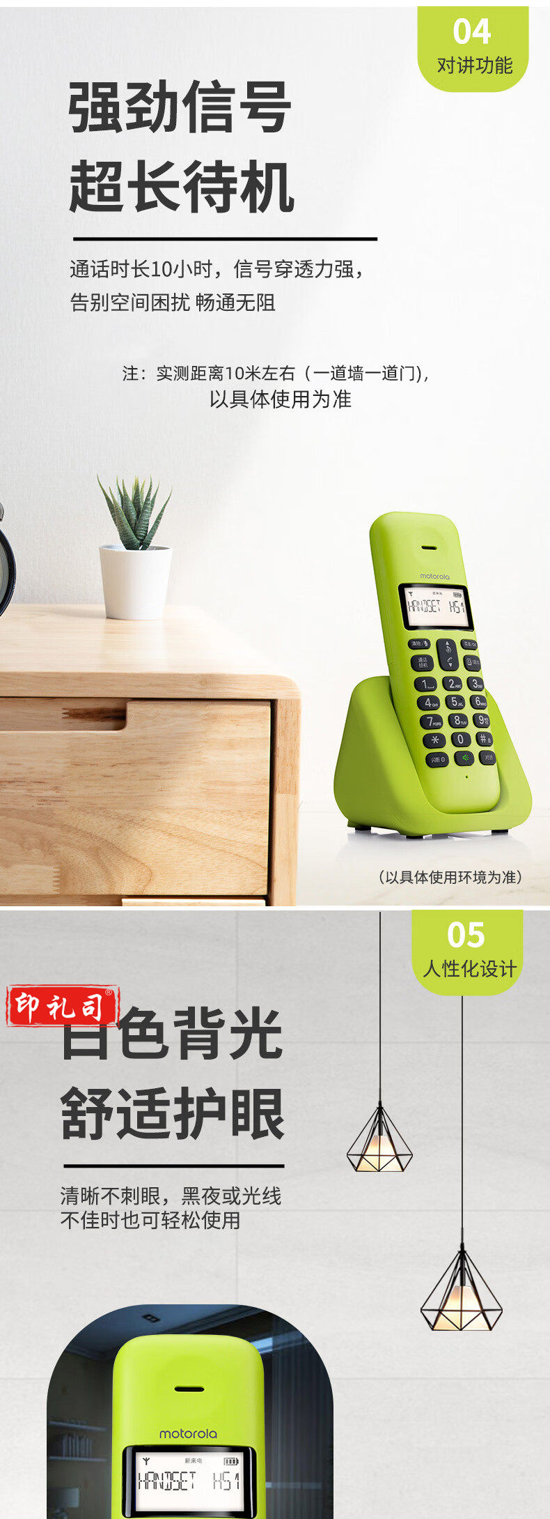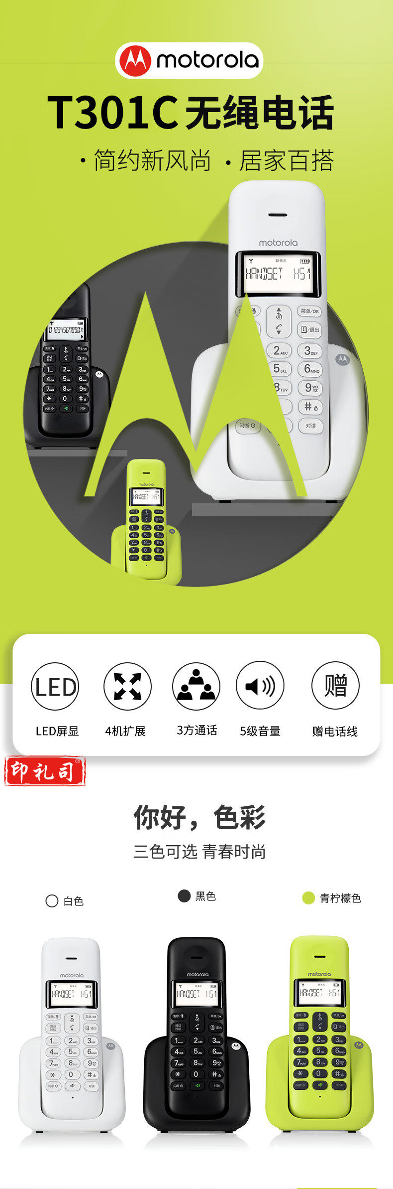 摩托罗拉/MotorolaT301C数字无绳电话机无线座机 大屏幕白色背光 清晰免提 家用办公单机 (柠檬色)
