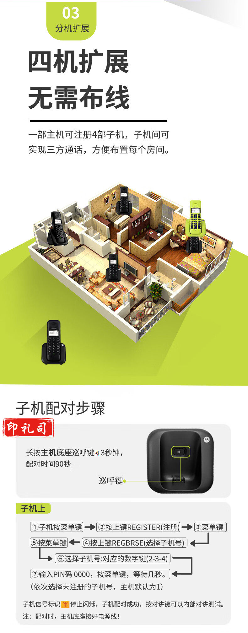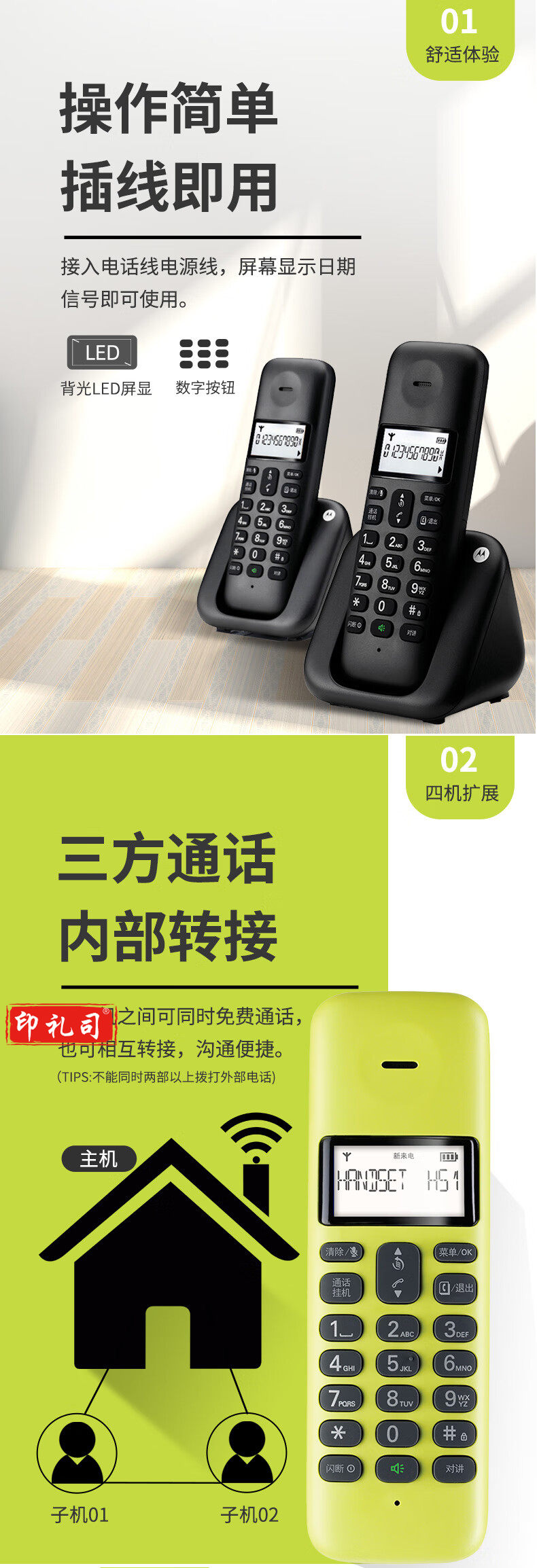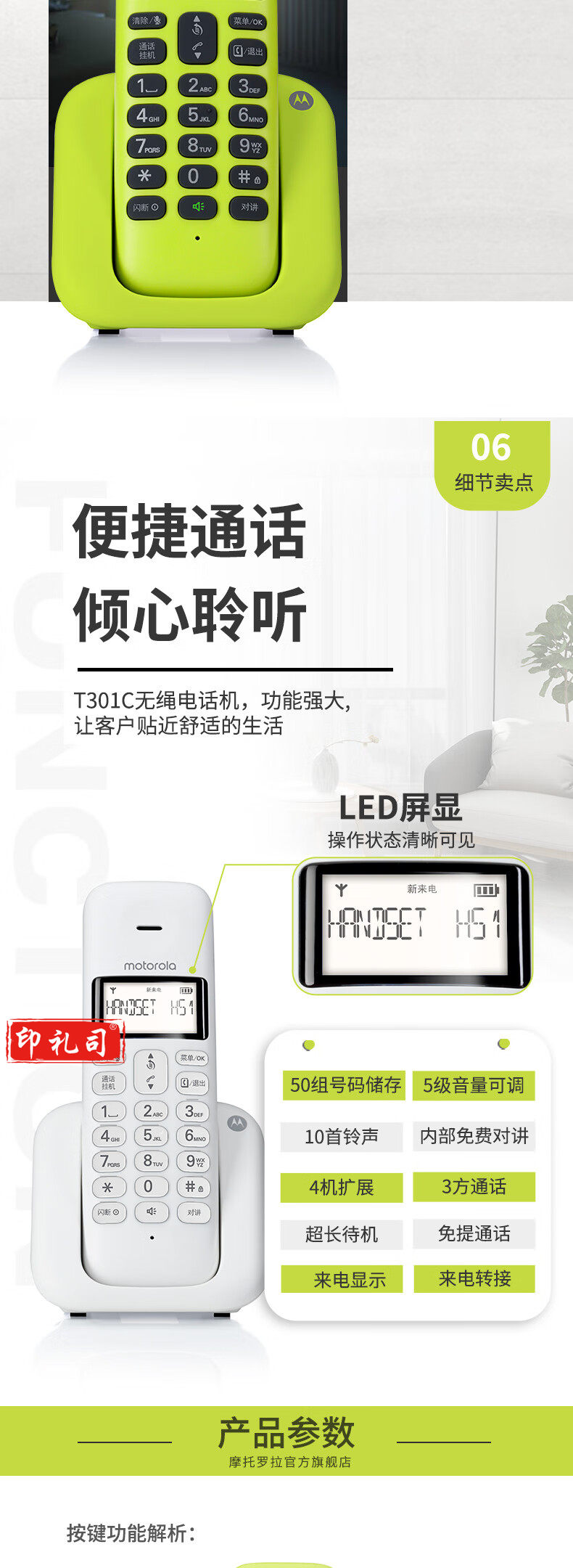 摩托罗拉/MotorolaT301C数字无绳电话机无线座机 大屏幕白色背光 清晰免提 家用办公单机 (柠檬色)
