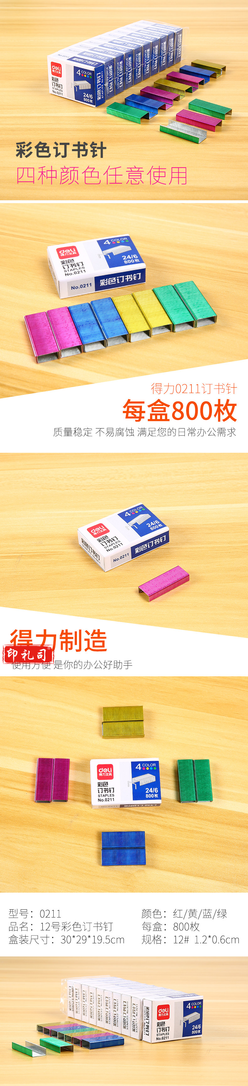 得力0211彩色订书钉12#(混)(800枚/盒)