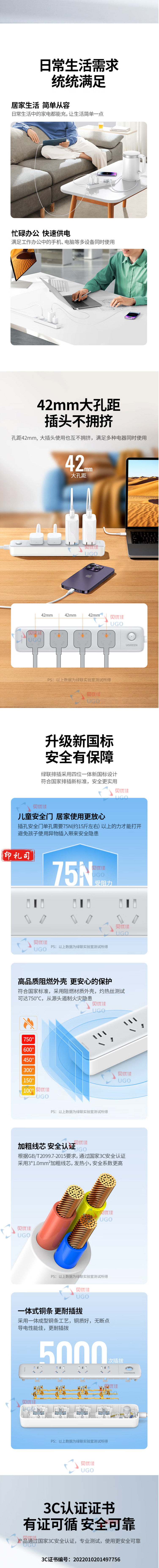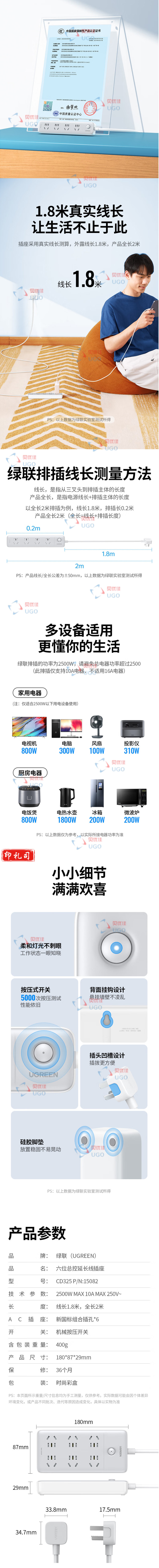 绿联(UGREEN)新国标6位总控插座 插线板/插排/排插/插板/接线板/拖线板宿舍家用全长5米 15300
