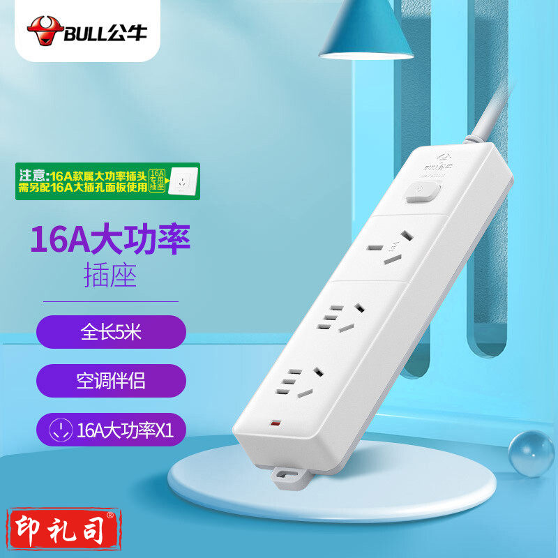 公牛(BULL)大功率16A空调插座/插线板/插排/排插/接线板/拖线板 3位总控全长5米 GN-406D