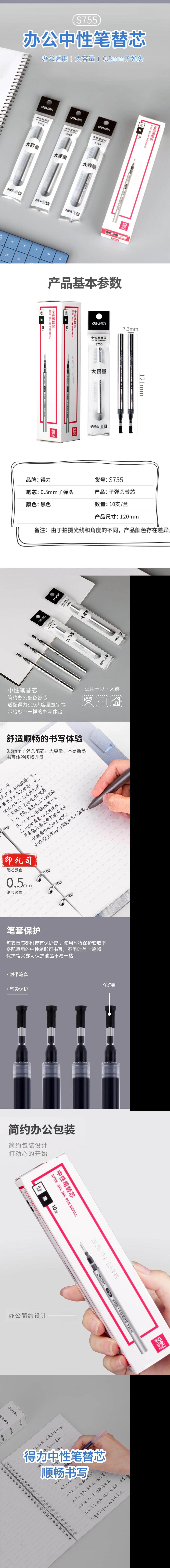 得力S755大容量中性笔芯0.5mm子弹头(黑)(10支)