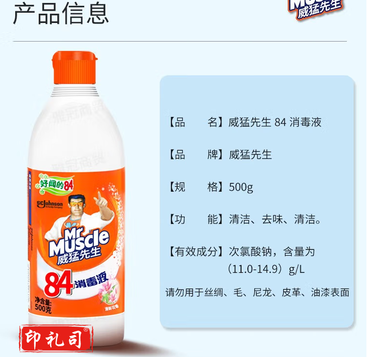 威猛先生 84消毒液 清新花香消毒水家用消毒衣服漂白水地面清洁 500g*20瓶 整箱