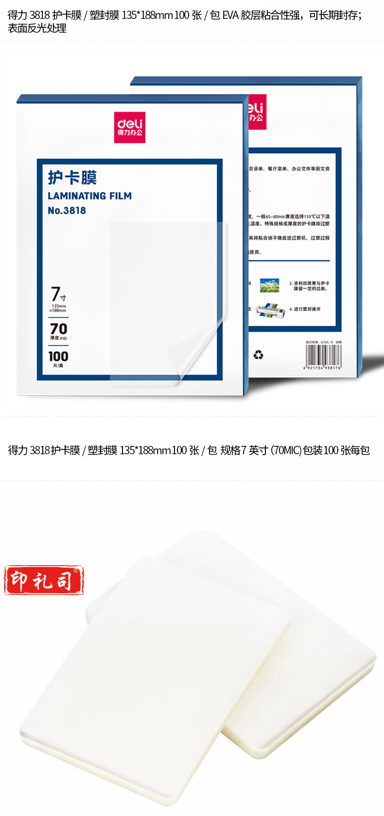得力 3818护卡膜/塑封膜 135*188mm100 张/包
