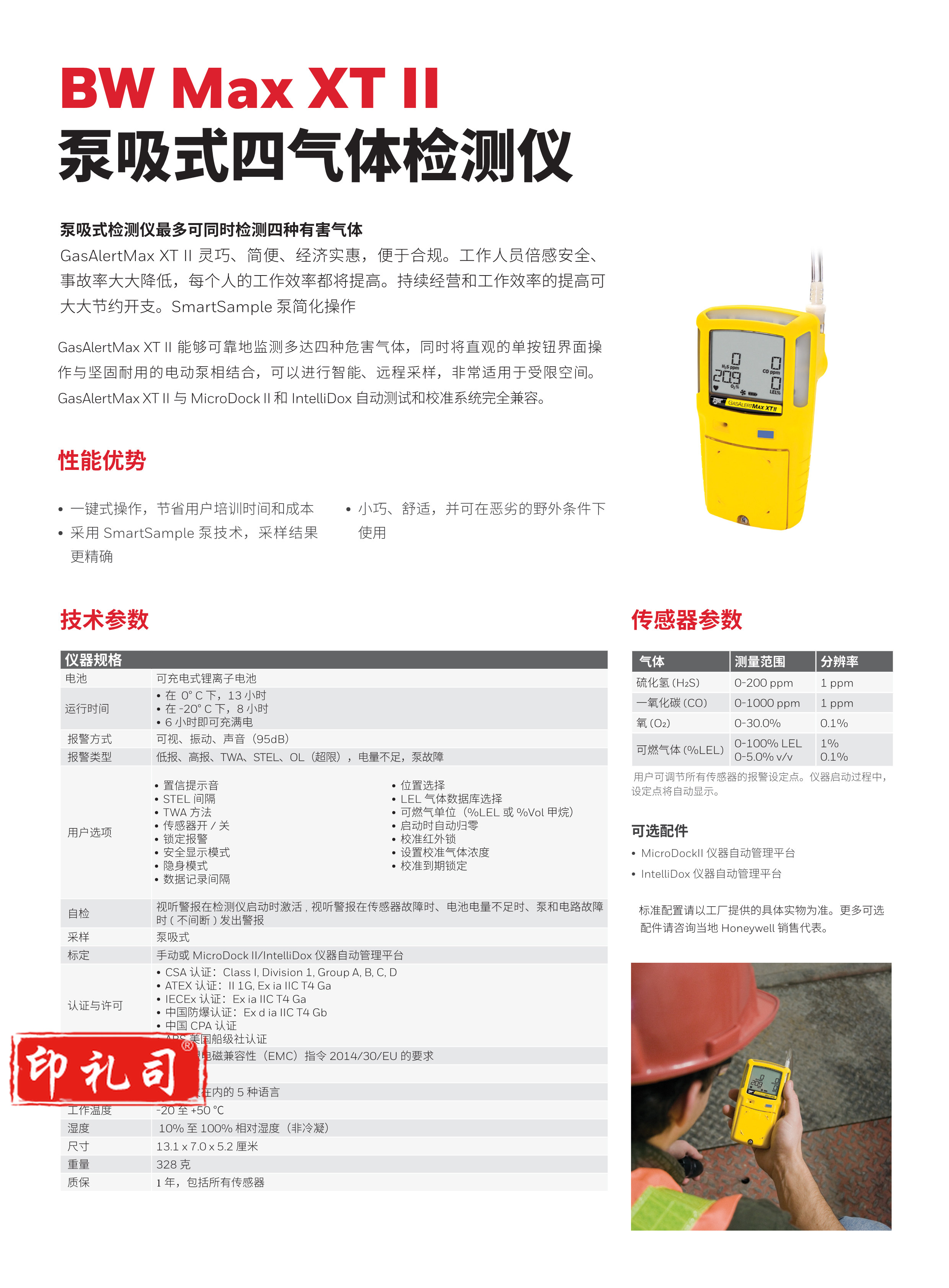 霍尼韦尔Honeywell泵吸式四合一气体检测仪 BW GasAlertMax XT II 氧气 一氧化碳 硫化氢 可燃气检测仪 XT-XWHM-Y-CN