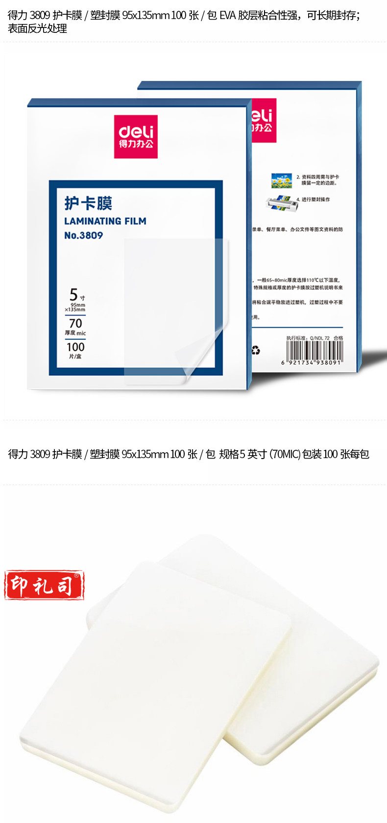 得力3809 塑封膜 护卡膜(透明)(100片/包) 95*135 5寸 单位:包
