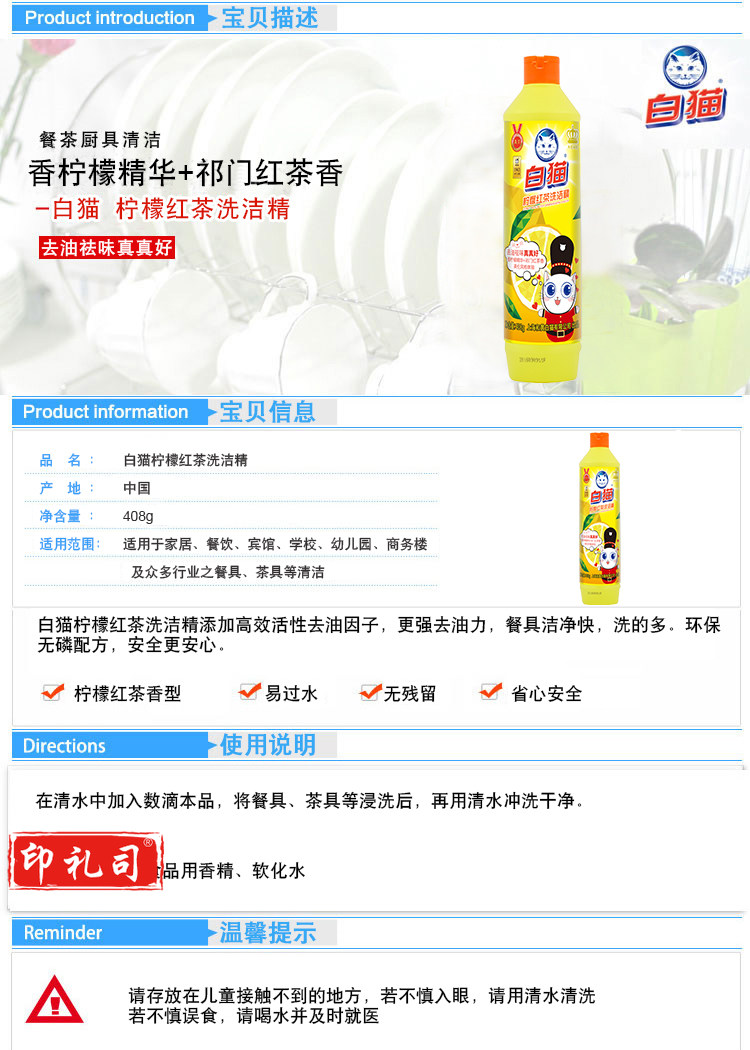 白猫(BAIMAO)洗洁精408g 每箱30瓶