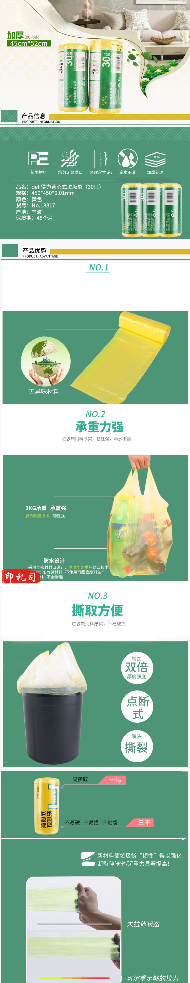 得力背心式垃圾袋 50*50CM 黄色(30只/卷)18817