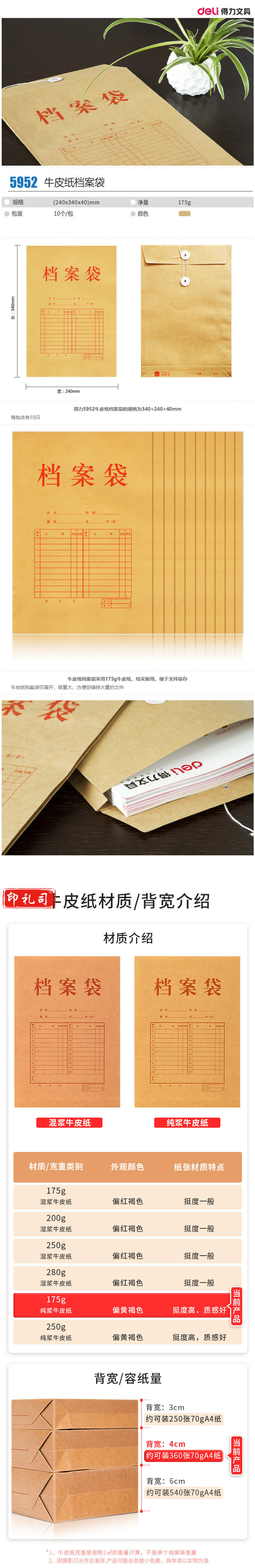 得力A 4牛皮纸档案袋 背宽4cm 纯浆 米黄色(10只装) 5952