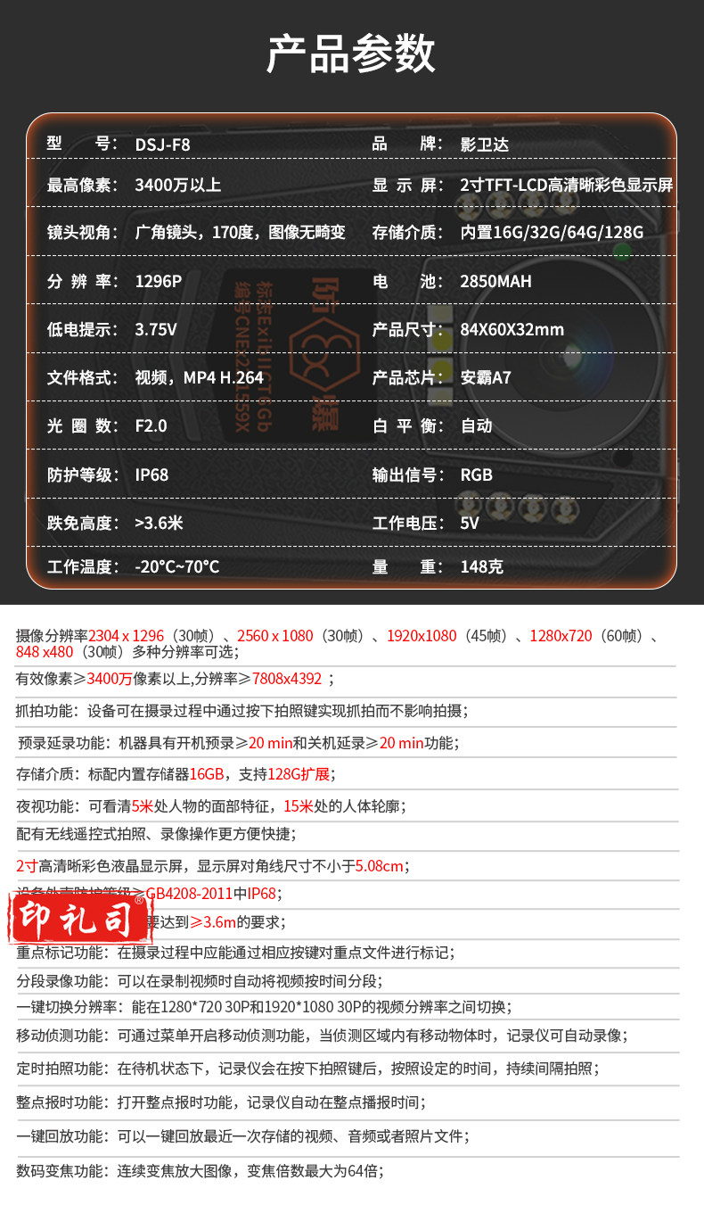 影卫达 执法记录仪DSJ-F8 防爆高清夜视 新版128G