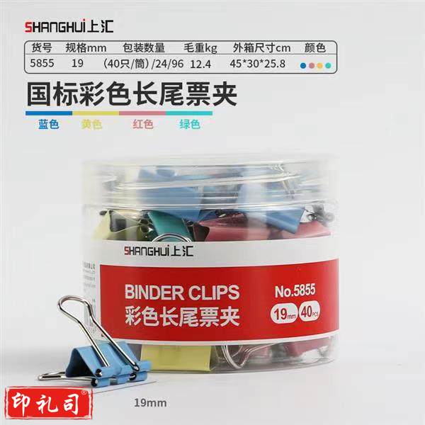 上汇长尾夹凤尾夹(19mm/40只/筒)文具办公资料铁夹黑色金属燕尾夹彩色大号文件夹小号票据试卷夹鱼尾夹不锈钢 5855彩色小号
