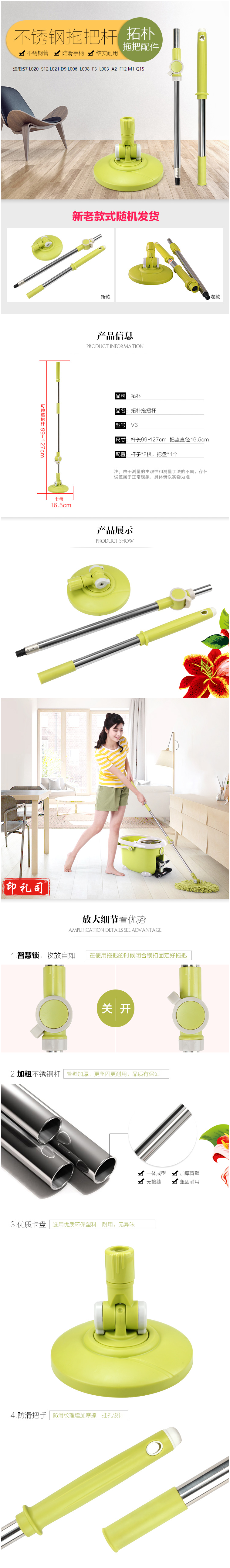 大卫 三节三代旋转拖把杆 多款通用拓朴拖把配件 V3拖把杆 柳黄色