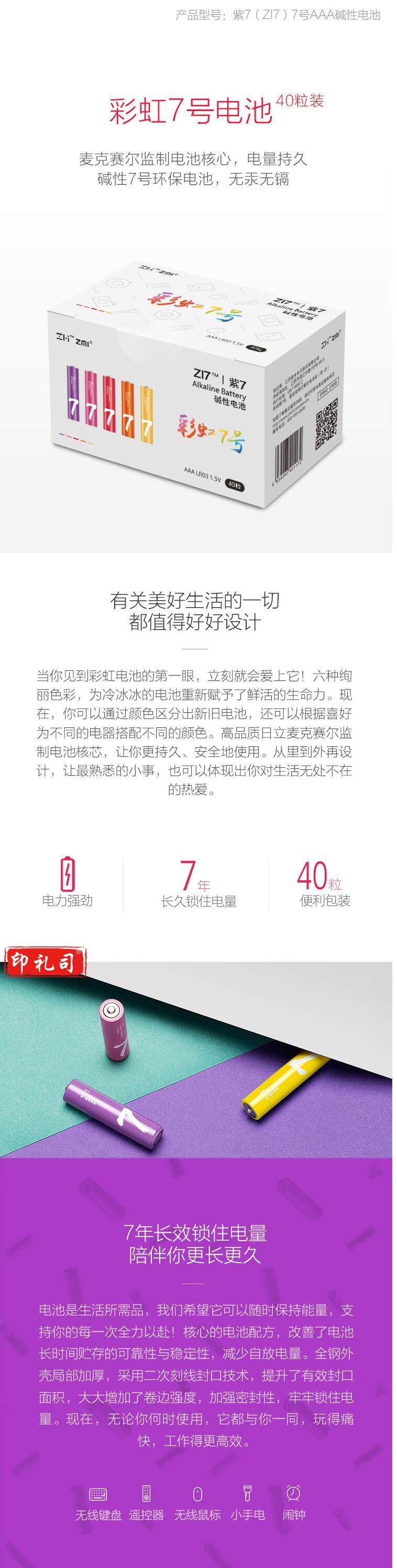 紫米(ZMI)ZMIAAA/LR03 紫米7号(如需5号下单请注明)/彩虹电池碱性 一盒为10节或40节/适用于鼠标/儿童玩具/智能门锁等一切能用的地方 jcyd-202104271080