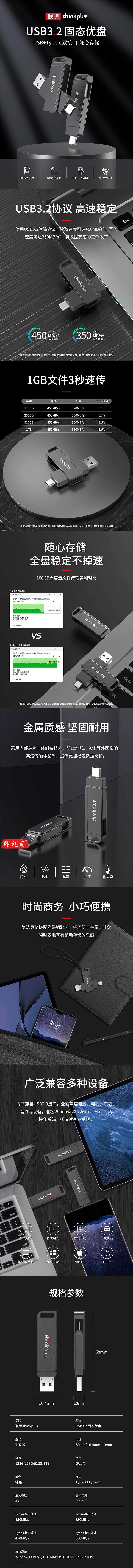 ThinkPad 联想 512G 双接口移动固态U盘USB3.2/Type-C 高速金属办公车载手机电脑两用优盘 TU202 jcyd-230418221324