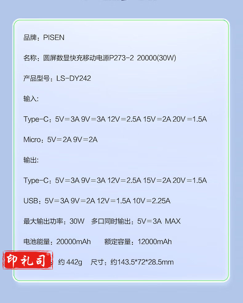 品胜20000毫安30W双向快充充电宝大容量移动电源27WPD20W数显便携适用苹果16华为mate xt小米